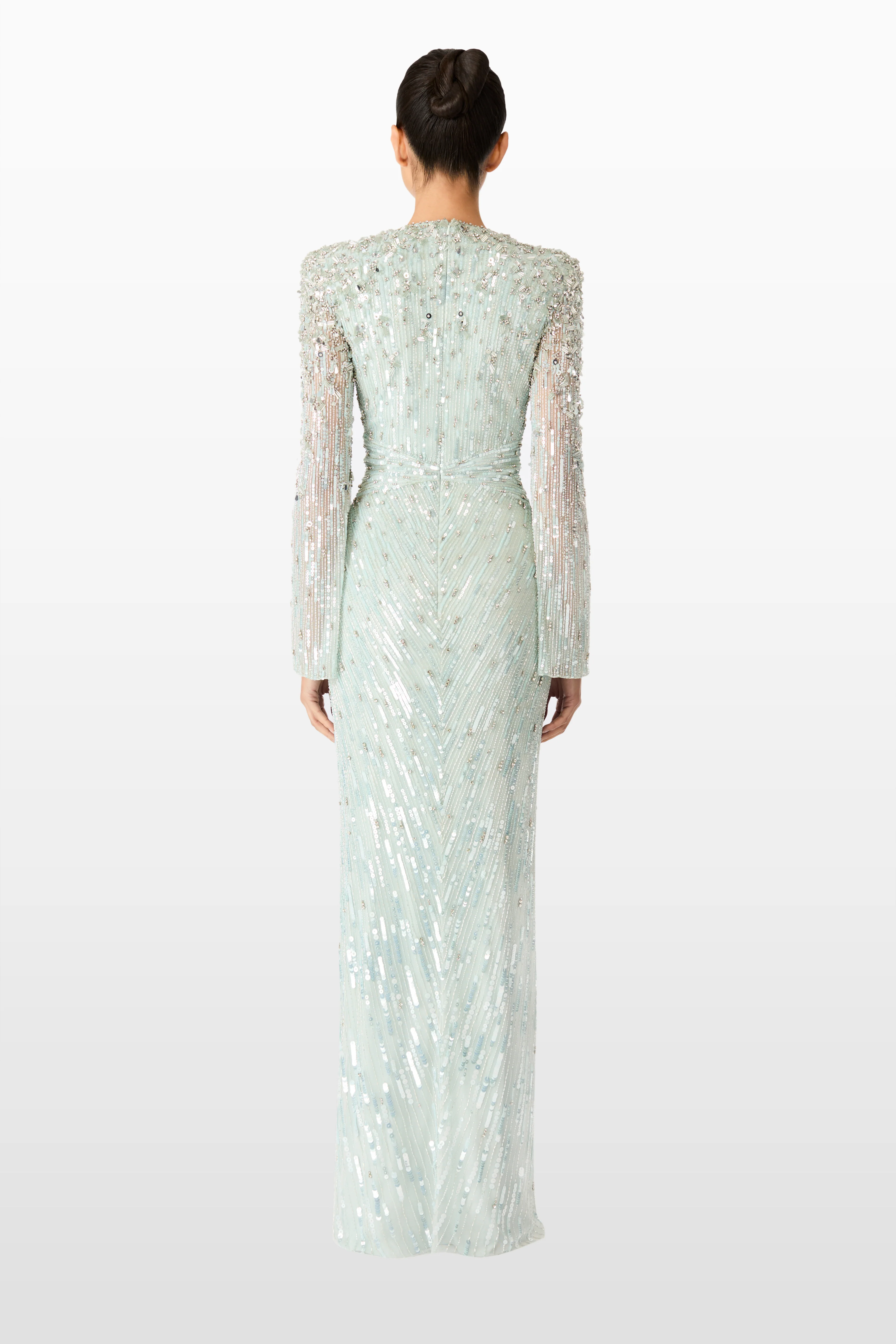 Radiate timeless elegance in the Tana gown, a stunning expression of understated luxury. This figure-flattering evening dress is adorned with shimmering sequins that catch the light at every angle, creating a soft, ethereal glow. The V-neckline introduces a modern element to the classic silhouette, while a fitted bodice and contoured seams sculpt a graceful hourglass shape. Statement shoulders, accented with intricate embellishments, add structure and artistry, enhancing the gown’s poised, polished look. Ideal for gala nights, winter weddings, and formal dinner events, the Tana gown brings together contemporary sophistication and old-world glamour. Whether you're making a red-carpet entrance or celebrating an unforgettable occasion, this dress ensures you’ll captivate from every angle with grace and shine.